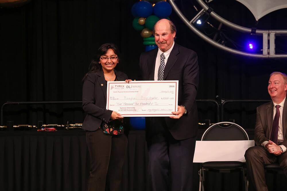 Amit2025-03-11T15:46:55+00:00The Austin Energy Regional Science Festival, commonly known as simply Science Fest, is one of Texas’ largest regional science fairs with almost 3,000 students from 3rd through 12th grade. At TyRex, we are proud to be part of the many engineers, scientists and professionals who volunteer with this program to help encourage the students who will become the next generation of our technology community and to reward their innovative research. This year, two TyRex companies – Austin Reliability Labs (ARL) and Digital Light Innovations (DLi) – each offered a student internship or scholarship of $2,500. Parker Whitehead of Vista Ridge High School took home the ARL scholarship for his biomedical project, ‘Functional 3D Printed Bone.’ The DLi scholarship, meanwhile, went to Raaghav Bageshwar of College Station High School for his microbiology project, ‘Probing the Oligomeric Structure of the TatBC Complex of the Twin-Arginine Transport Pathway.’ Needless to say, with the innovative thinking displayed through these projects, the technology community of the future is in good hands!